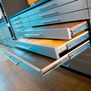 اسلایدهای کشو تعیین می کنند که آیا کشوها یکنواخت و بی سر و صدا باز و بسته می شوند. اسلایدهای با کیفیت بالا به طور معمول دارای یک طراحی سه بخش هستند و به کشوها اجازه می دهند تا دسترسی آسان را به طور کامل گسترش دهند. آنها به طور معمول از فولاد نورد سرد با یک سطح برقی یا پوشیده از اسپری برای مقاومت در برابر خوردگی تقویت می شوند. اسلایدها با عملکردهای میرایی یا برگشتی نیز محبوب هستند. اسلایدهای میرایی به کشوها اجازه می دهند به آرامی بسته شوند و از پین شدن جلوگیری کنند. اسلایدهای Rebound به طور خودکار با یک فشار سبک روی صفحه کشو ظاهر می شوند و نیاز به نصب دسته و تقویت ظاهر تمیز کابینت را از بین می برند.
